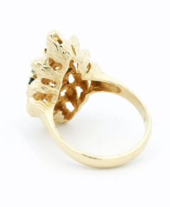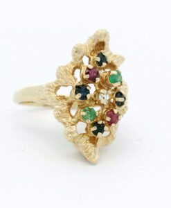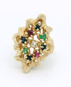 The head of the ring has a wavy bark texture and is set with diamond, emerald, sapphire and ruby gemstones