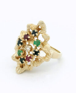 Brutalist 9ct Gold Multi Gem Cluster Ring dated 1977, set with diamond, emerald, sapphire and ruby gemstones.