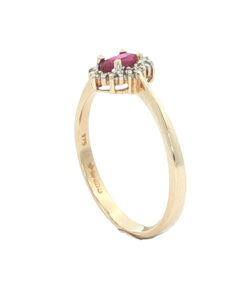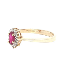 At the centre of the cluster you will find an oval cut ruby surrounded by a halo of claw set accent diamonds.