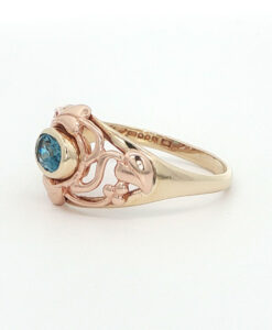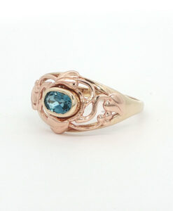 This beautiful Tree of Life birthstone ring by Cymru is a wonderful fusion of Celtic heritage and modern elegance. At its centre sits a bezel-set oval-cut blue topaz (7mm x 5mm). The shoulders are adorned with the iconic Celtic never-ending knot of the Tree of Life, finely crafted in warm Welsh 9ct rose gold against 9ct yellow gold. This meaningful design represents eternity, strength, and connection — making it a truly symbolic and timeless piece.