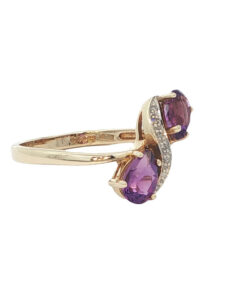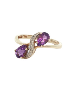 A truly charming piece, this 9ct yellow gold ring features two vibrant pear-cut amethysts, their rich purple tones full of depth and elegance. Flowing gracefully between them is a swirl of white gold, set with sparkling illusion-set diamond accents that add the perfect touch of brilliance and contrast.