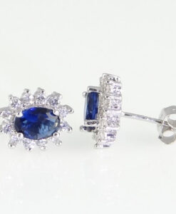 A glistening pair of sterling silver stud earrings featuring a deep blue crystal surrounded by a cluster of white cubic zirconia stones.