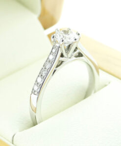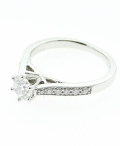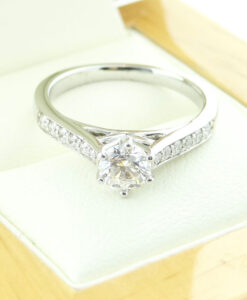 The sparkling 88 facet brilliant cut 0.48ct central solitaire stone is set in a traditional 6 claw setting.