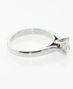 The sparkling princess cut diamond is set in a contemporary four claw picture frame setting.