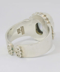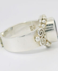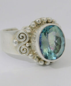 This is a gorgeous Blue Topaz ring by Sajen. The blue topaz stone is oval with a flat top and faceted sides. It has been bezel set. The shoulders are wide and are decorated with scrolls at the top.