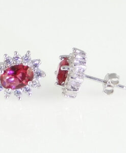 A glistening pair of sterling silver stud earrings featuring a sparkling red crystal surrounded by a cluster of white cubic zirconia stones.