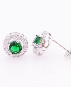 A glistening pair of sterling silver stud earrings featuring a vibrant green crystal surrounded by a halo of white cubic zirconia stones.