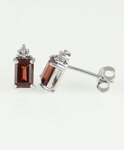 A beautiful pair of sterling silver garnet and diamond earrings.  The garnet gemstones are enhanced by a sparkling accent diamond.  The garnets have been claw set. These earrings have sterling silver butterfly fasteners.