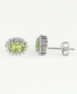 Each earring is set with an oval cut peridot gemstone and two accent diamonds.