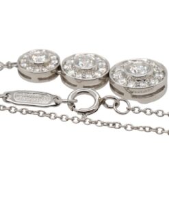 A truly beautiful Tiffany & Co. diamond pendant set in platinum. The elegant triple drop pendant from the Circlet collection, features three diamond circular motifs. The diamonds have been claw and rubover set in platinum. The graduating circles have a total diamond weight of 0.55ct. The diamonds are estimated to range from F-G in colour with VVS clarity. The pendant is attached to a platinum Tiffany & Co 18 inch trace chain.