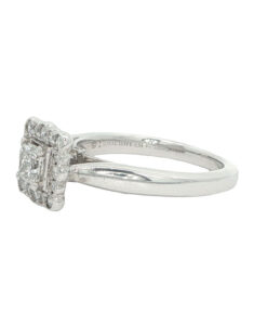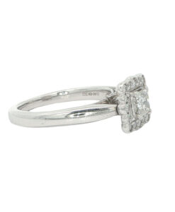 This sparkling diamond Ideal Love cluster ring from TOLKOWSKY is beautifully crafted in 14ct white gold. The central square .37ct diamond has been claw set. This is surrounded by a halo of round brilliant cut diamonds, that have been claw set with a very pretty millegrain frilled edge.