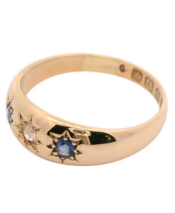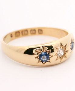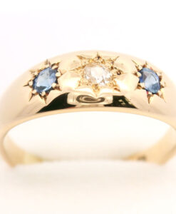 This antique 18ct gold ring from 1901 is a stunning example of late Victorian jewellery craftsmanship. It features two old cut sapphires and a diamond, the stones are securely claw-set in stars.