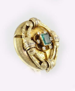 It is set with 26 old cut diamonds and an emerald cut emerald.