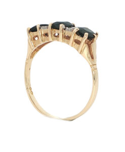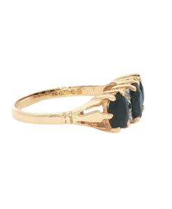 A striking vintage sapphire and diamond ring, beautifully crafted in 18ct yellow gold. This elegant ring features three rich oval-cut sapphires, each securely claw set, and separated by sparkling accent diamonds illusion set in white gold. The gemstones are arranged in a classic row design, creating a timeless look that blends sophistication with vintage allure.