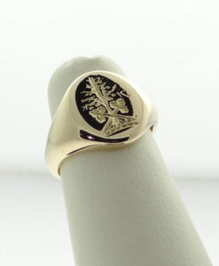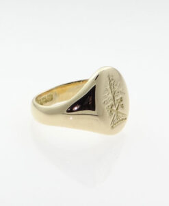 A vintage 1920’s 18ct gold seal signet ring. It is engraved with an image of a tree crossed by two swords.