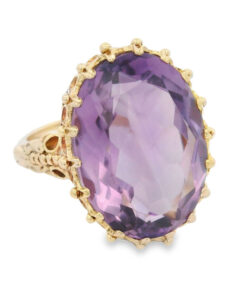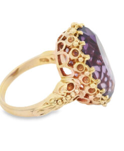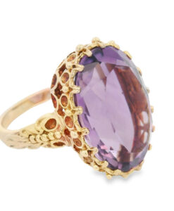 Presenting a sensational vintage 9ct gold dress ring, showcasing a magnificent amethyst gemstone. The large, claw-set amethyst takes center stage, embraced by an intricately designed setting that exudes elegance and sophistication. Crafted from 9ct yellow gold, the shoulders and shank complement the stunning gemstone perfectly.