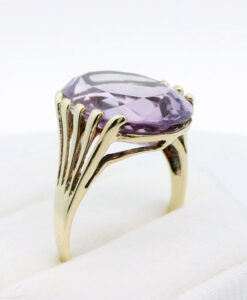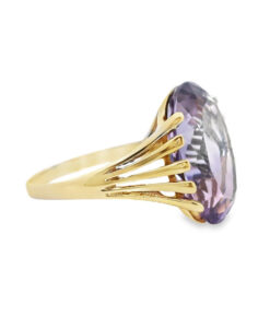 Presenting a stunning vintage 9ct gold dress ring, featuring a magnificent oval cut amethyst as its centrepiece. The gemstone is securely held by elegant claw settings that seamlessly extend from the shoulders, enhancing its beauty and presence.