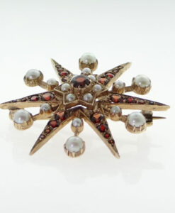 A beautiful Victorian style 9ct yellow gold garnet and seed pearl starburst brooch.