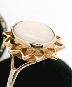 Vintage 9ct Gold Oval Opal Ring with sunshine halo and triple spilt design shoulders.