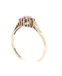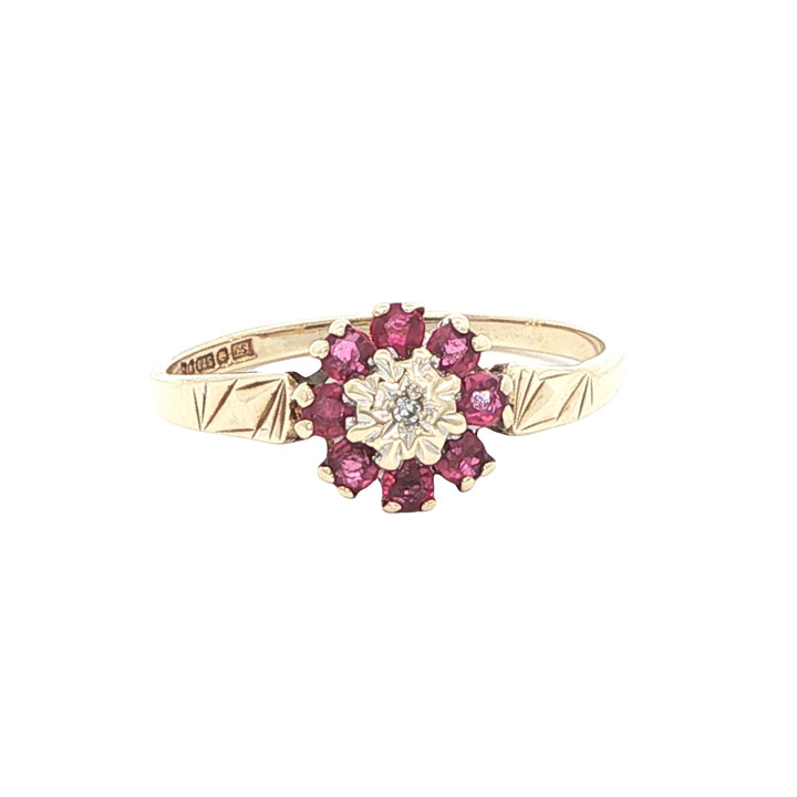 Eight rubies surround a central diamond. The diamond has been illusion set in 9ct gold.