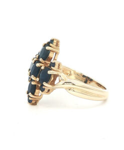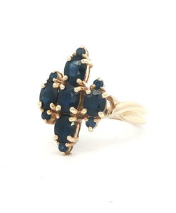 A striking sapphire cluster ring, beautifully crafted in 9ct yellow gold. Each deep blue sapphire is securely claw set in a cross-inspired cluster, creating a design that is both timeless and elegant.