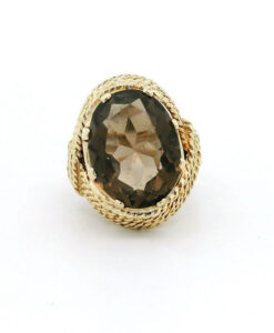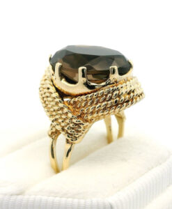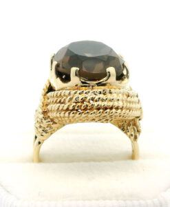 This is the most fabulous 9ct gold ring set with a large Smoky Quartz gemstone. The stone has been claw set set in a glorious crown on top of an intricate weave design of 9ct gold. This really is a true statement piece.