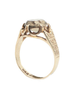 A fabulous vintage 9ct gold smoky quartz ring from the late 1970’s. The smoky quartz has been claw set in a high setting to allow the light to pass through the stone. The wide shoulders, typical of the period are embossed with stars.