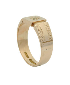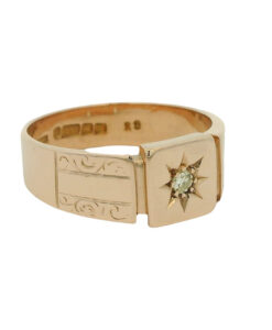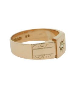 A beautiful antique signet ring crafted in solid 9ct rose gold, featuring a sparkling star-set diamond at its centre.