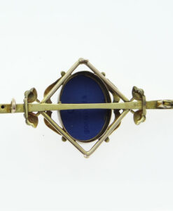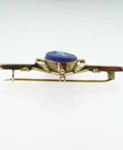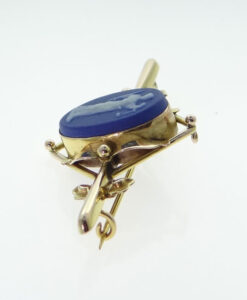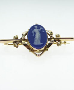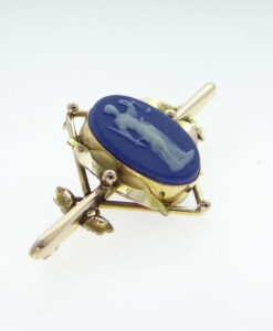 This is a stunning 9ct rose gold Wedgewood Jasperware cameo brooch. The Jasperware cameo is cobalt blue. It is stamped WEDGEWOOD. In excellent condition. Dated: c1930 Stamped: 9CT Weight: 4.6 grams Measurements: 52mm x 25mm approx.
