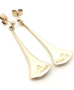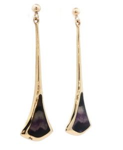 A fabulous pair of vintage drop earrings crafted in rich 9ct yellow gold, featuring striking fan-shaped Blue John gemstones. Each stone displays natural swirls of light and dark purple and is securely rim set to showcase its unique beauty.