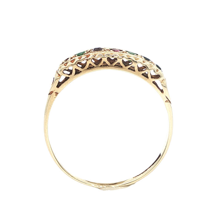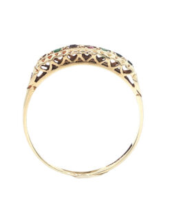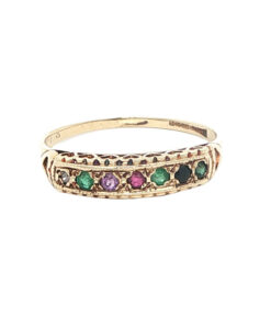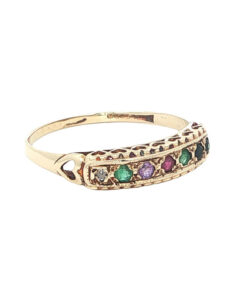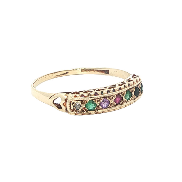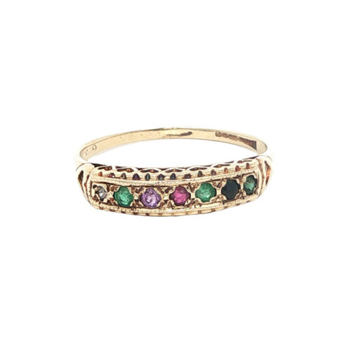 A sentimental and symbolic piece, this charming vintage ring is crafted in 9ct yellow gold and set with gemstones that spell out the word DEAREST – Diamond, Emerald, Amethyst, Ruby, Emerald, Sapphire, and Topaz. Each stone carries meaning, making this a truly romantic piece of jewellery, full of love and sentiment.