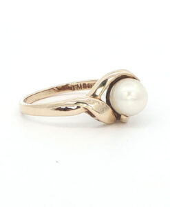 A charming vintage 9ct yellow gold ring, elegantly crafted with a luminous central pearl in a graceful twist setting. The design perfectly balances simplicity with timeless sophistication, making it a beautiful choice for everyday elegance or a special occasion.
