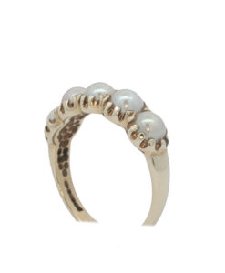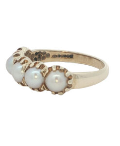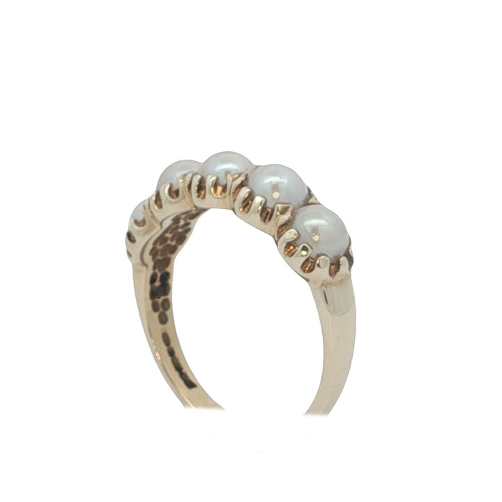 A charming vintage 9ct yellow gold ring, beautifully designed with five luminous pearls set in a row. The pearls capture the perfect balance of simplicity and timeless sophistication, making it a lovely choice for everyday elegance or a special occasion.