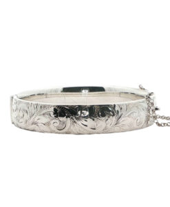 A stunning sterling silver bangle from the late 1960s, crafted by the renowned Danish silversmith Georg Jensen for the London boutique. This exquisite piece features an intricate swirl engraving on the front, with a sleek, polished back for a sophisticated contrast.