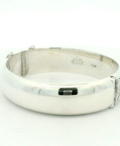 The bangle fastens securely with a classic snap-in clasp and features a safety chain for added peace of mind.