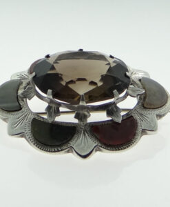 This lovely Scottish silver brooch is set with Agate stone and a large Smokey Quartz gemstone.