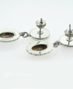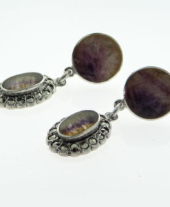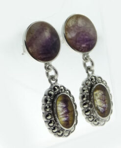 A fabulous pair of Sterling Silver Blue John and Marcasite drop earrings. The oval Blue John stone drop is set with a marcasite surround.