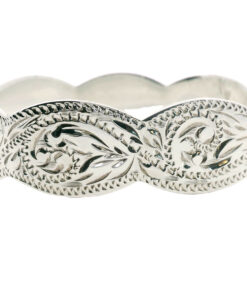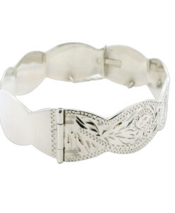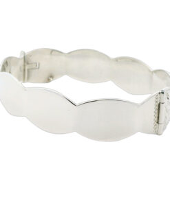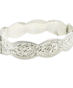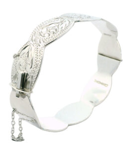The front is engraved with a classic decorative design, framed perfectly by a fluted edge that gives the bangle an unmistakably unique character. It features a secure snap-in fastener and safety chain, combining beauty with practicality.