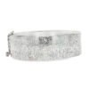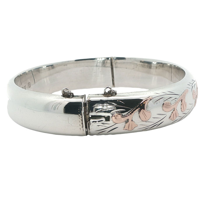 The bangle has a 12mm width and an elegant oval shape (approx. 6cm x 5.6cm inside measurements), offering a comfortable, contouring fit on the wrist. It fastens with a secure snap-in clasp and includes a safety chain, as seen in the image, for added peace of mind during wear.
