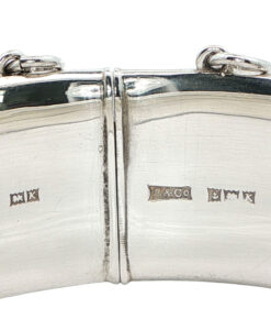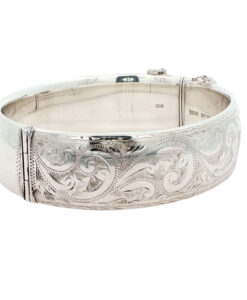 This classic hinged bangle features intricate hand-engraved foliate scrollwork on the front, contrasted by a plain polished reverse. The design reflects the timeless elegance of mid-century British silver jewellery. It opens on a discreet side hinge and fastens securely with a tongue clasp and original safety chain.